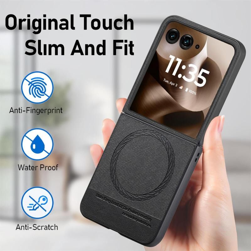 Θήκη κινητού τηλεφώνου με μαγνητική πλάτη για Motorola Razr 60, από ύφασμα Twill και δέρμα (Μαύρο)