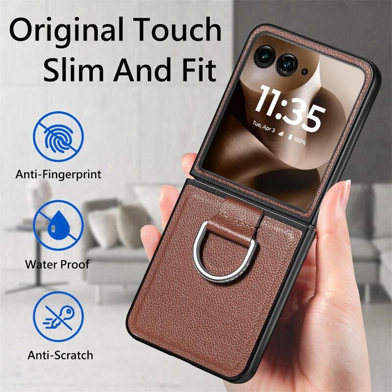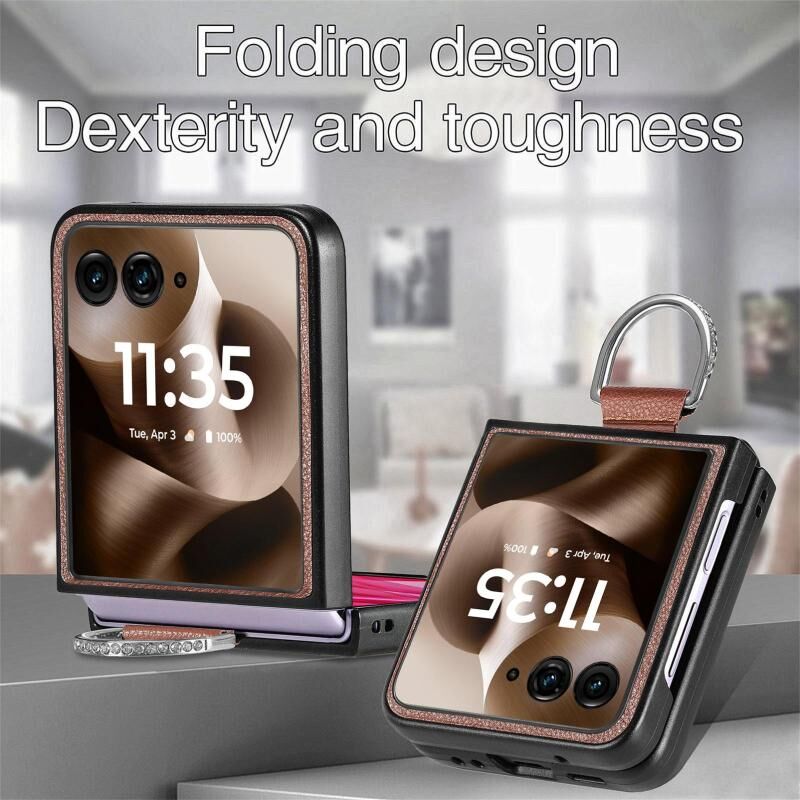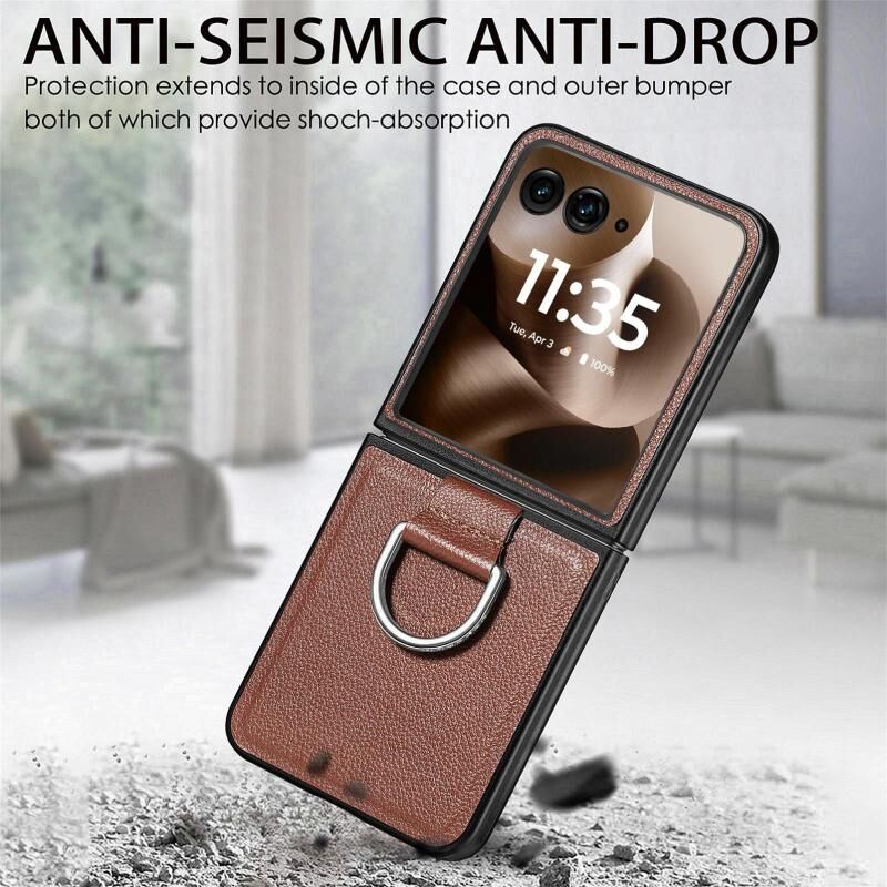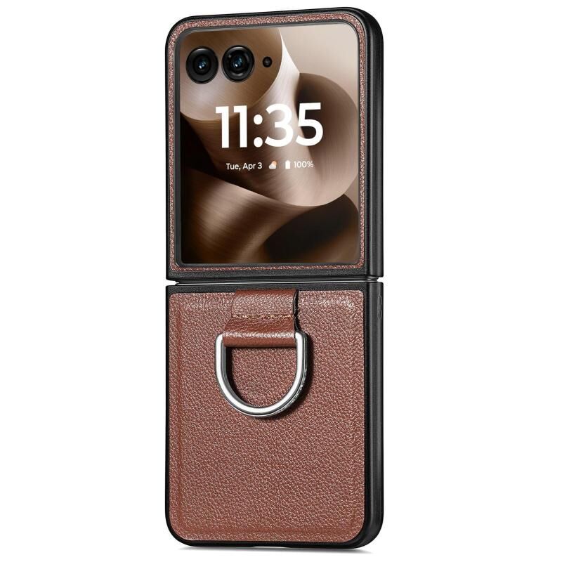 Θήκη τηλεφώνου με δακτύλιο και υφή δέρματος Litchi για Motorola Razr 60 Ultra (Καφέ)