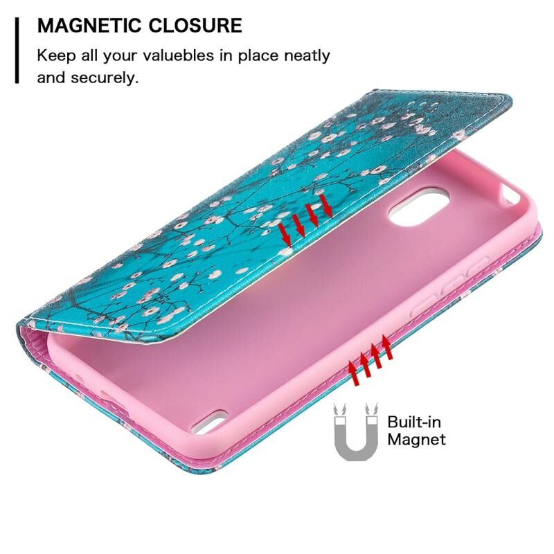 Θήκη για Nokia 1.3 με πολύχρωμο σχέδιο, αόρατο μαγνητικό, οριζόντιο flip από δερματίνη PU με βάση & υποδοχές καρτών & πορτοφόλι (Λουλούδι Δαμασκηνιάς)