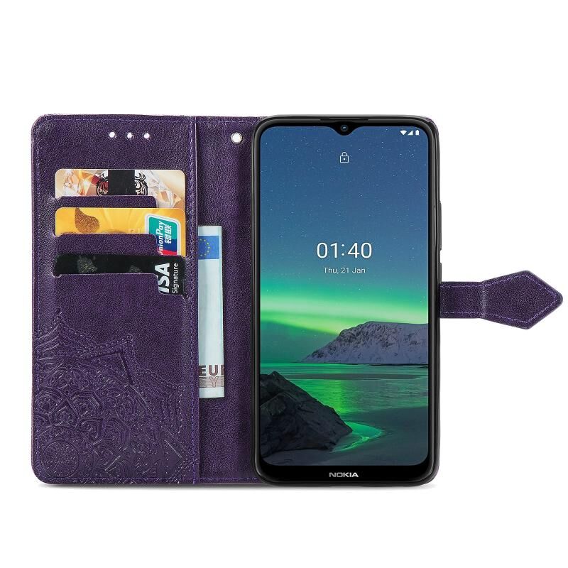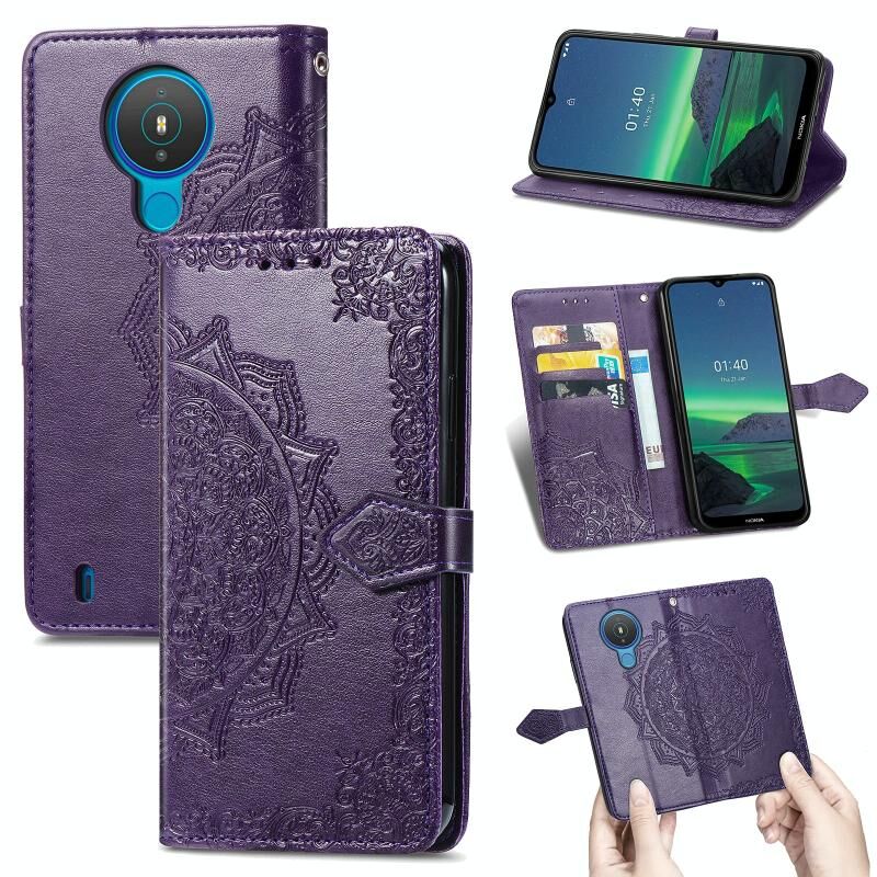 Για Nokia 1.4 Mandala λουλούδι ανάγλυφο οριζόντια Flip δερμάτινη θήκη με βραχίονα / υποδοχή για κάρτες / πορτοφόλι / κορδόνι (μωβ)