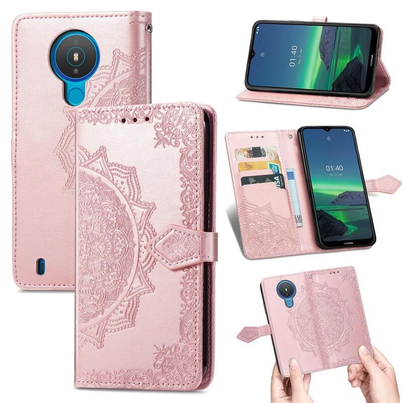 Για Nokia 1.4 Mandala λουλούδι ανάγλυφο οριζόντια Flip δερμάτινη θήκη με βραχίονα / υποδοχή για κάρτες / πορτοφόλι / κορδόνι (Rose Gold)