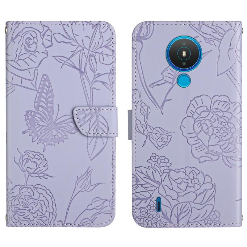 Θήκη τηλεφώνου Nokia 1.4, Δερμάτινη με ανάγλυφο σχέδιο πεταλούδας και παιώνιας (Κόκκινη)