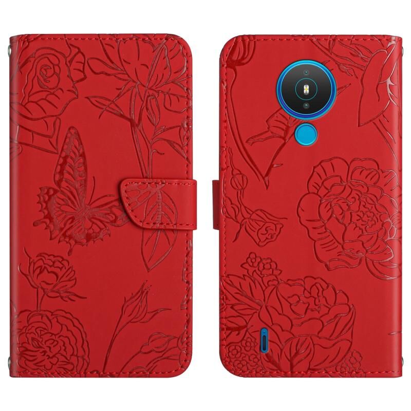 Θήκη τηλεφώνου Nokia 1.4, Δερμάτινη με ανάγλυφο σχέδιο πεταλούδας και παιώνιας (Κόκκινη)
