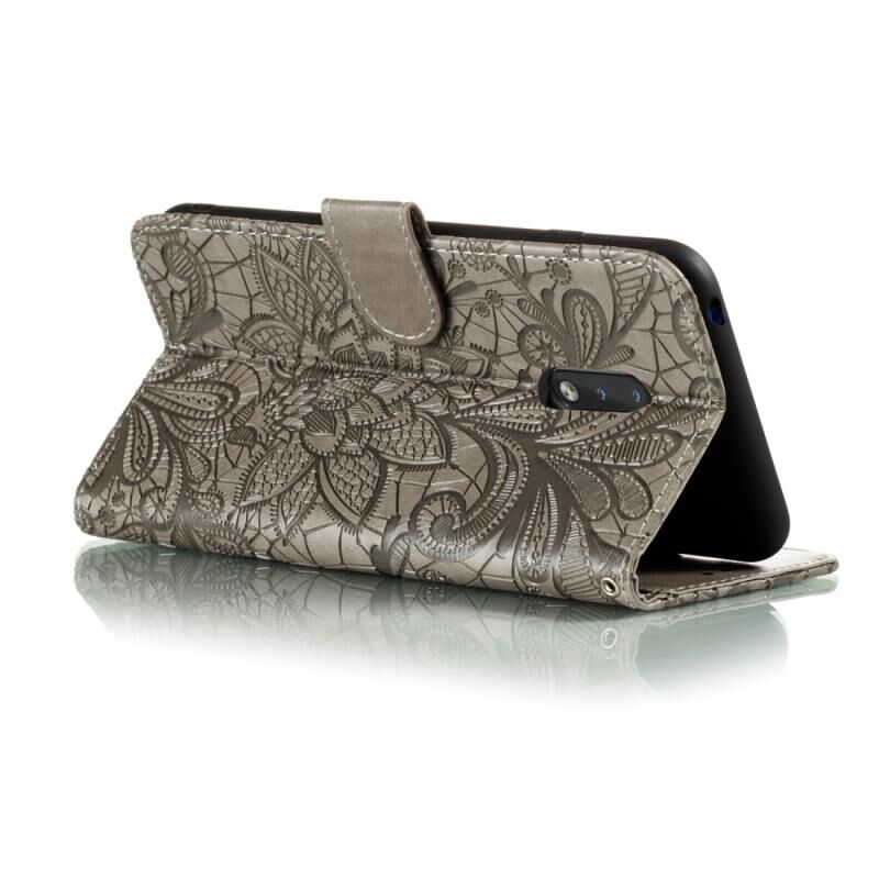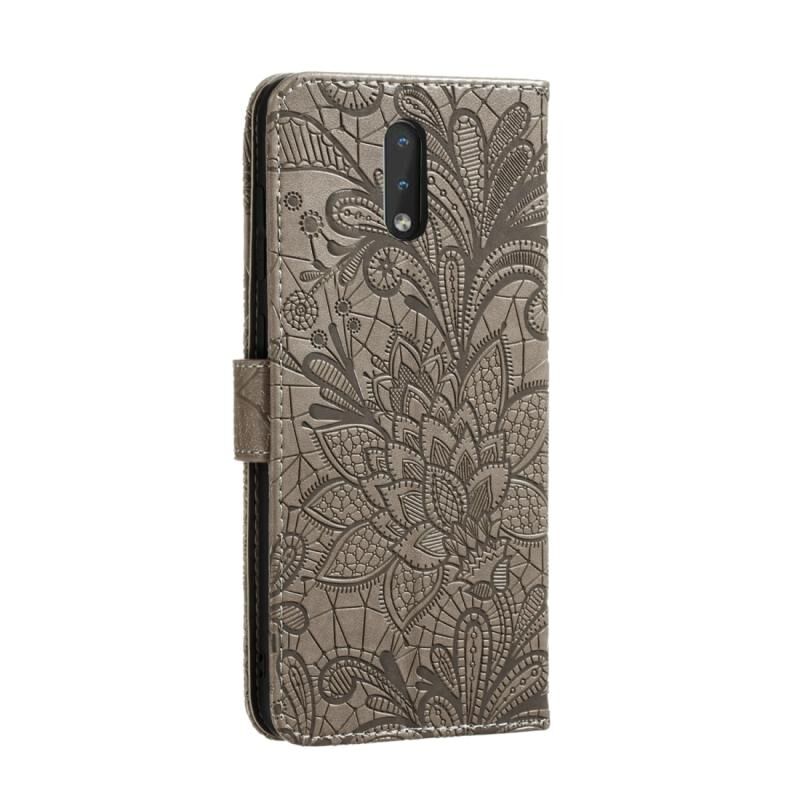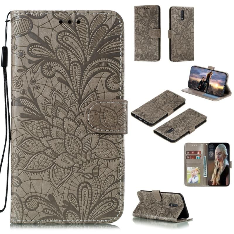 For Nokia 2.3 Lace Flower Embossing Pattern Horizontal Flip Leather Case , with Holder & Card Slots & Wallet & Photo Frame & Lanyard(Grey)