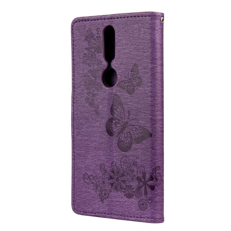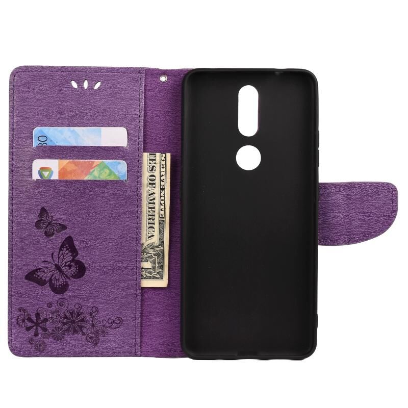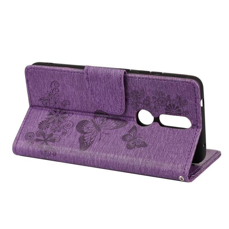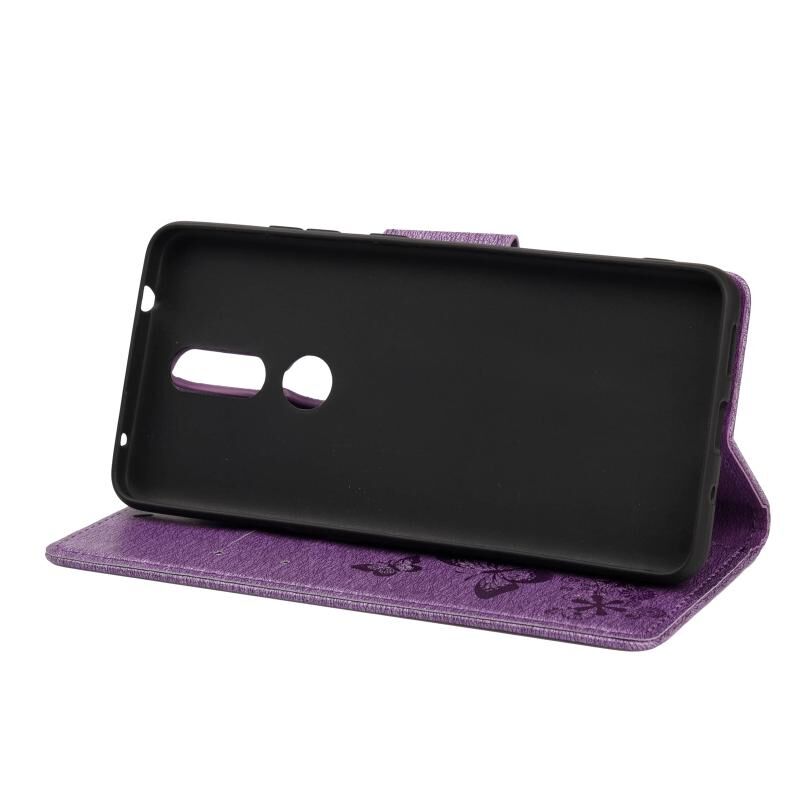 Θήκη δέρματος οριζόντιας αναδίπλωσης για Nokia 2.4 με σχέδιο πεταλούδων, ανάγλυφο, με βάση & υποδοχές καρτών & πορτοφόλι (Μαύρο)