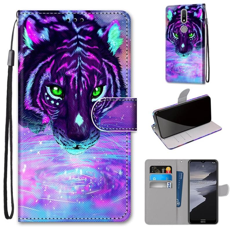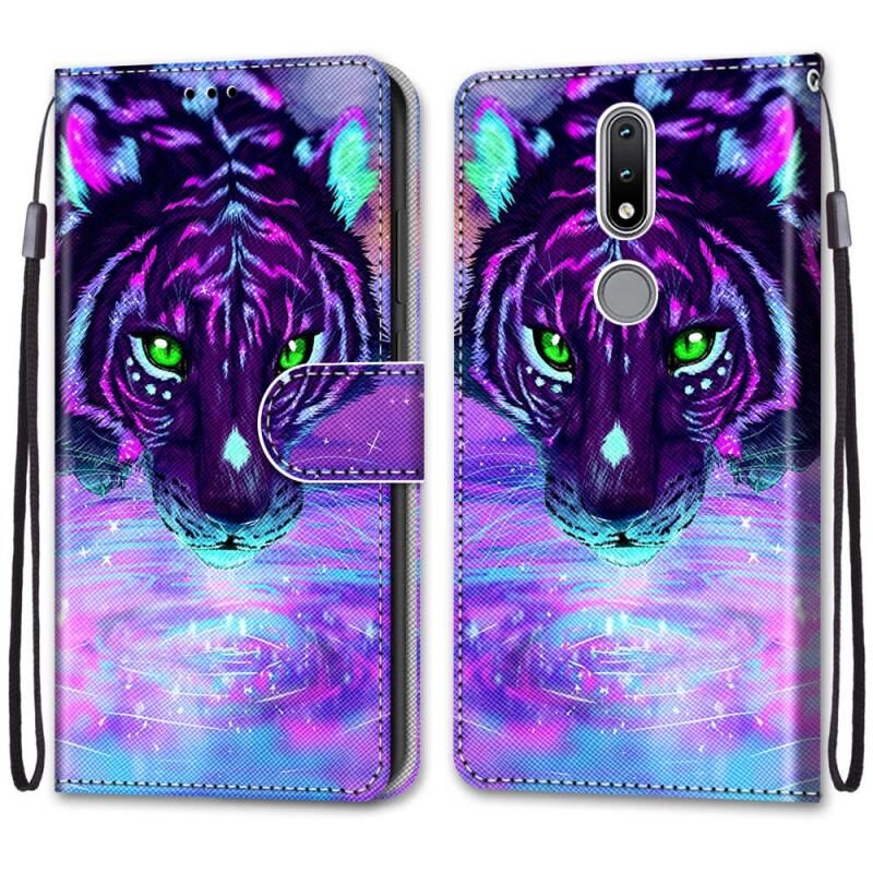 Θήκη για Nokia 2.4 από Δερματίνη PU με Σταυρωτή Υφή, Οριζόντια Ανοίγματα, Χρωματιστό Σχέδιο (Τίγρης που Πίνει Νερό), με Θήκη, Θήκες Καρτών, Πορτοφόλι & Λουρί.