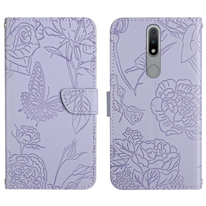 Θήκη τηλεφώνου από ανάγλυφο δέρμα για Nokia 2.4, με σχέδιο πεταλούδας και παιώνιας (Κόκκινο)
