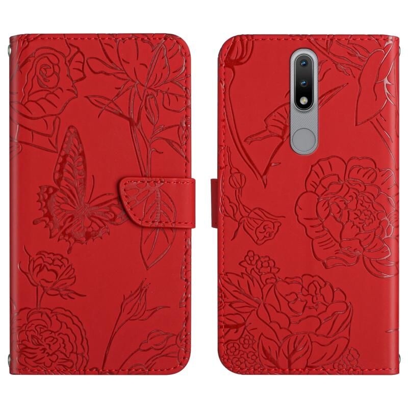 Θήκη τηλεφώνου από ανάγλυφο δέρμα για Nokia 2.4, με σχέδιο πεταλούδας και παιώνιας (Κόκκινο)