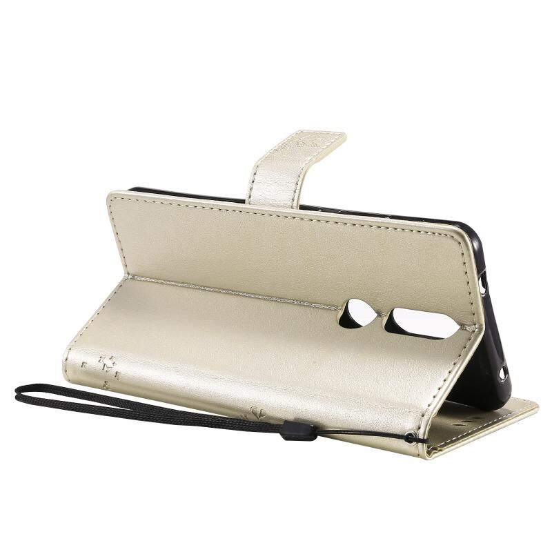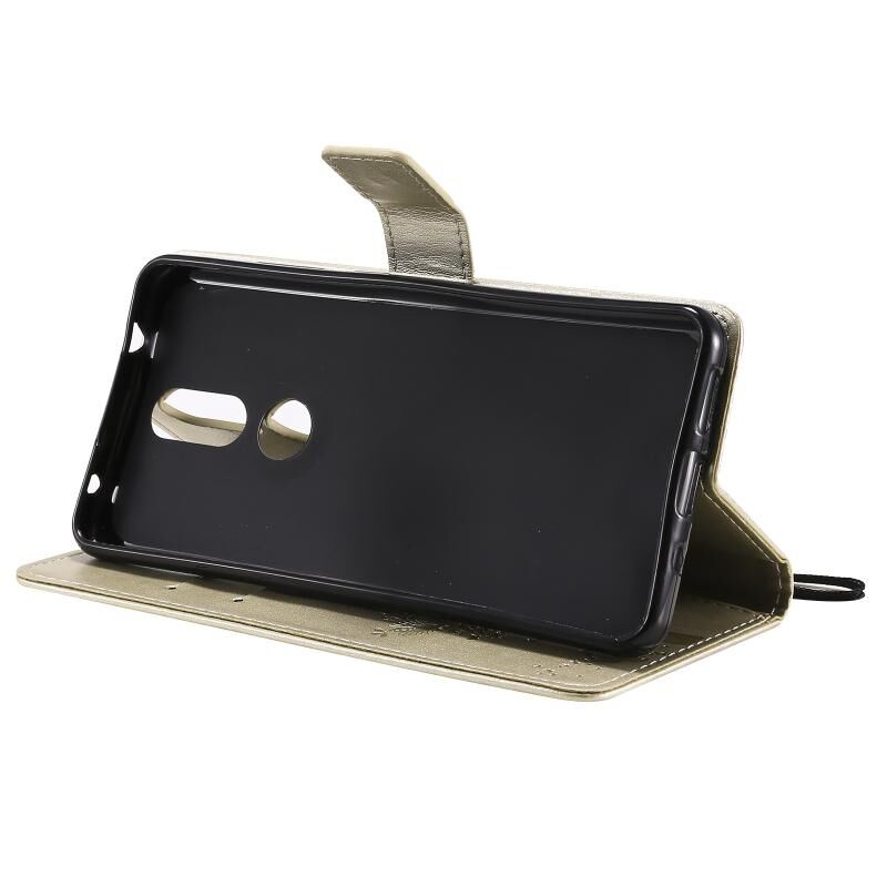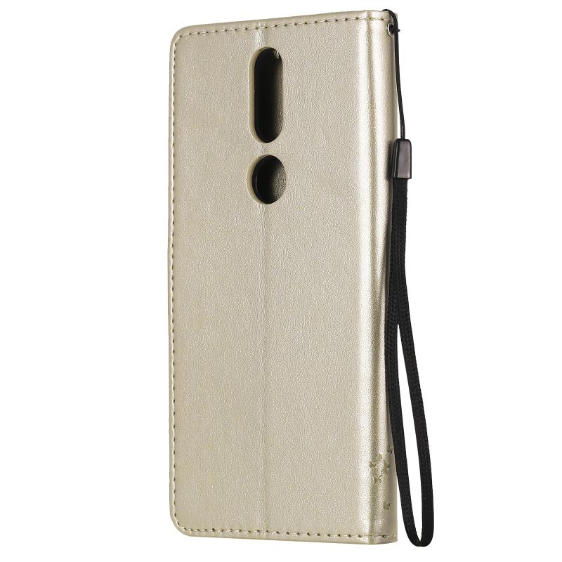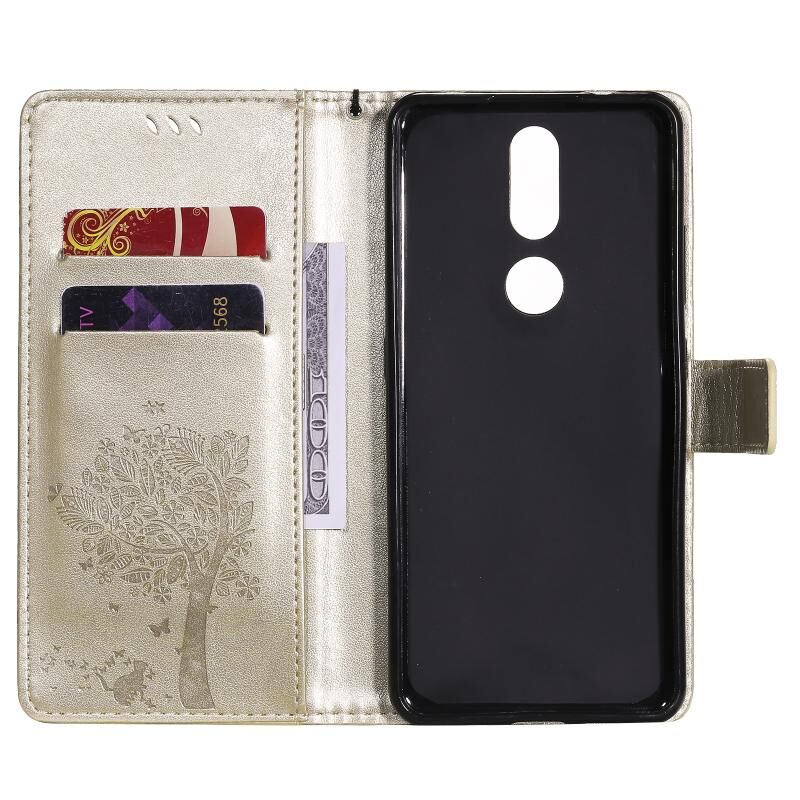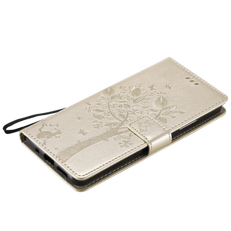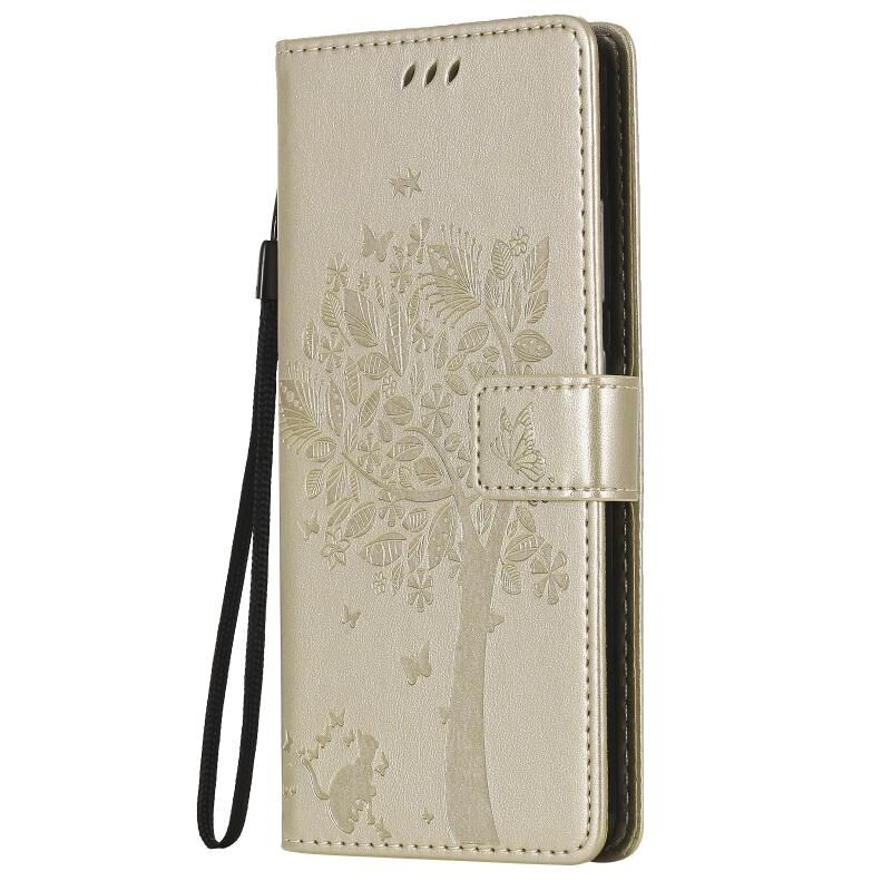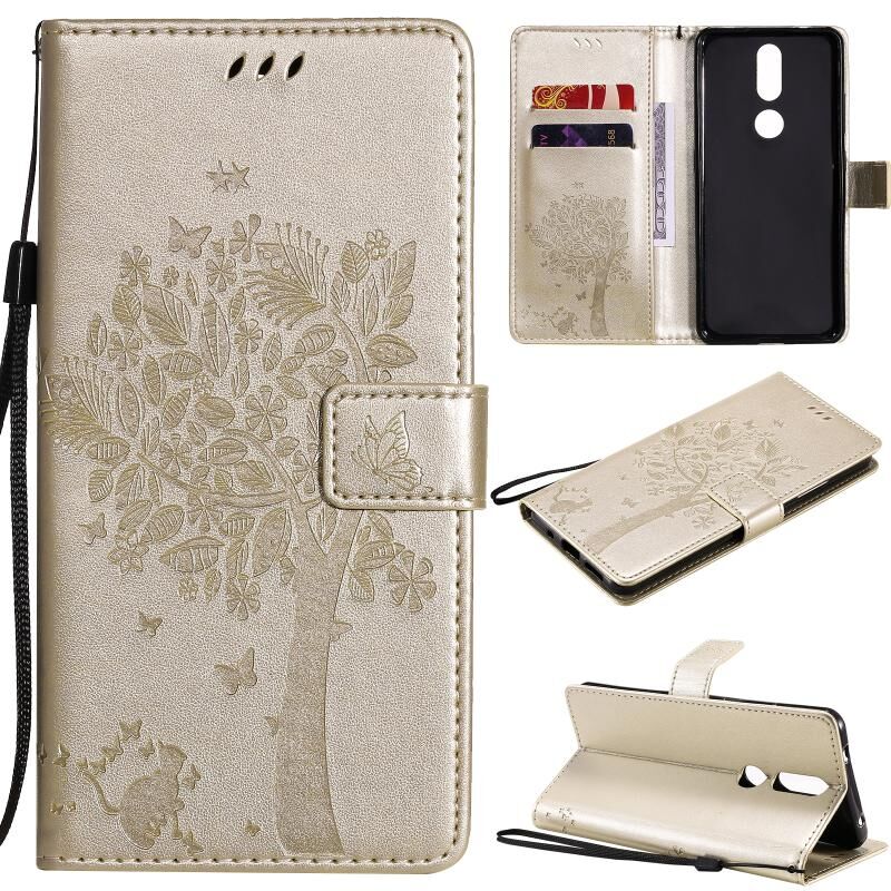 For Nokia 2.4 Tree & Cat Pattern Pressed Printing Horizontal Flip PU Leather Case with Holder & Card Slots & Wallet & Lanyard(Gold)
