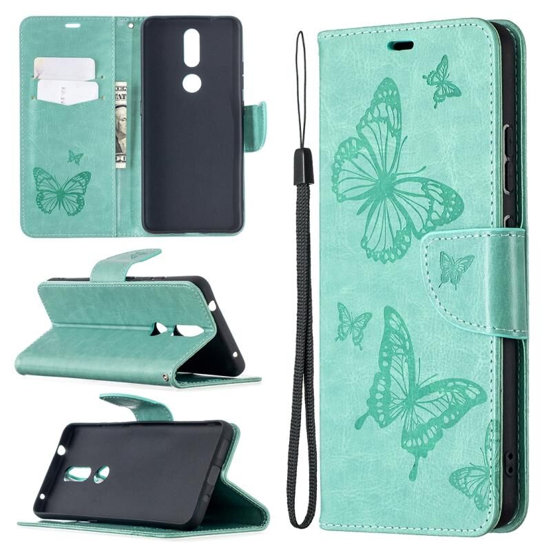 Θήκη δέρματος οριζόντιας αναδίπλωσης για Nokia 2.4 με σχέδιο δύο πεταλούδων, ανάγλυφο, με βάση στήριξης, θήκη για κάρτες, πορτοφόλι και κορδόνι (Χρυσό Ρόδι)