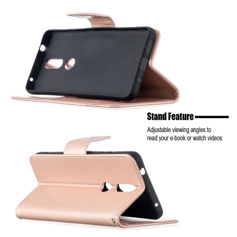 Θήκη δέρματος οριζόντιας αναδίπλωσης για Nokia 2.4 με σχέδιο δύο πεταλούδων, ανάγλυφο, με βάση στήριξης, θήκη για κάρτες, πορτοφόλι και κορδόνι (Χρυσό Ρόδι)