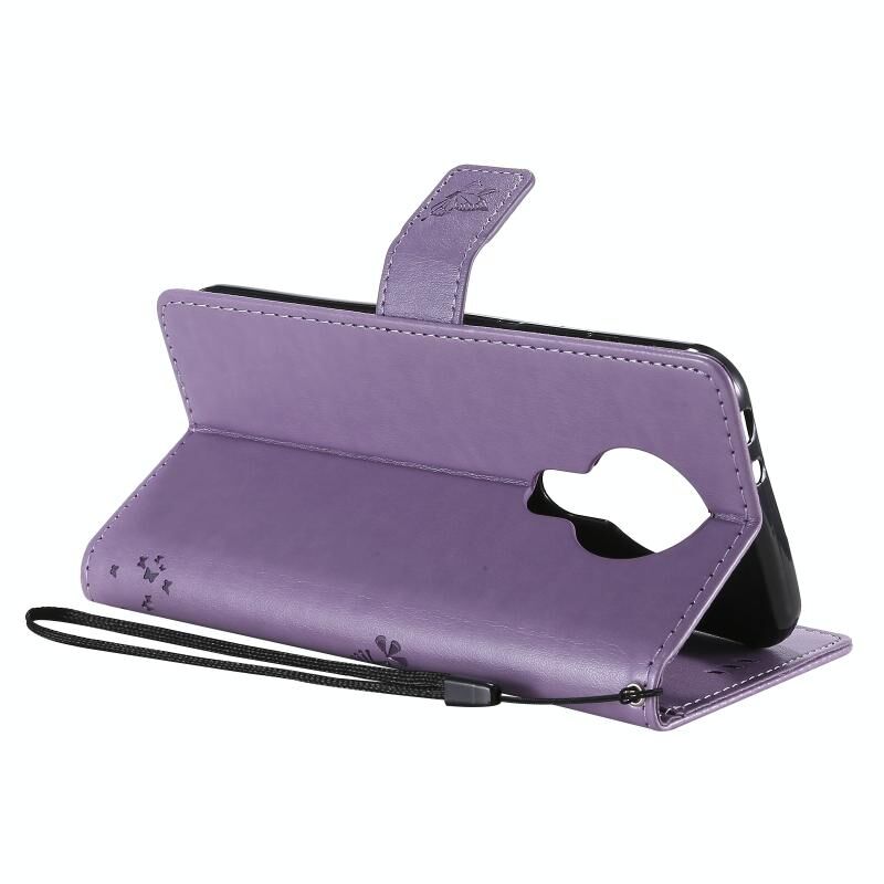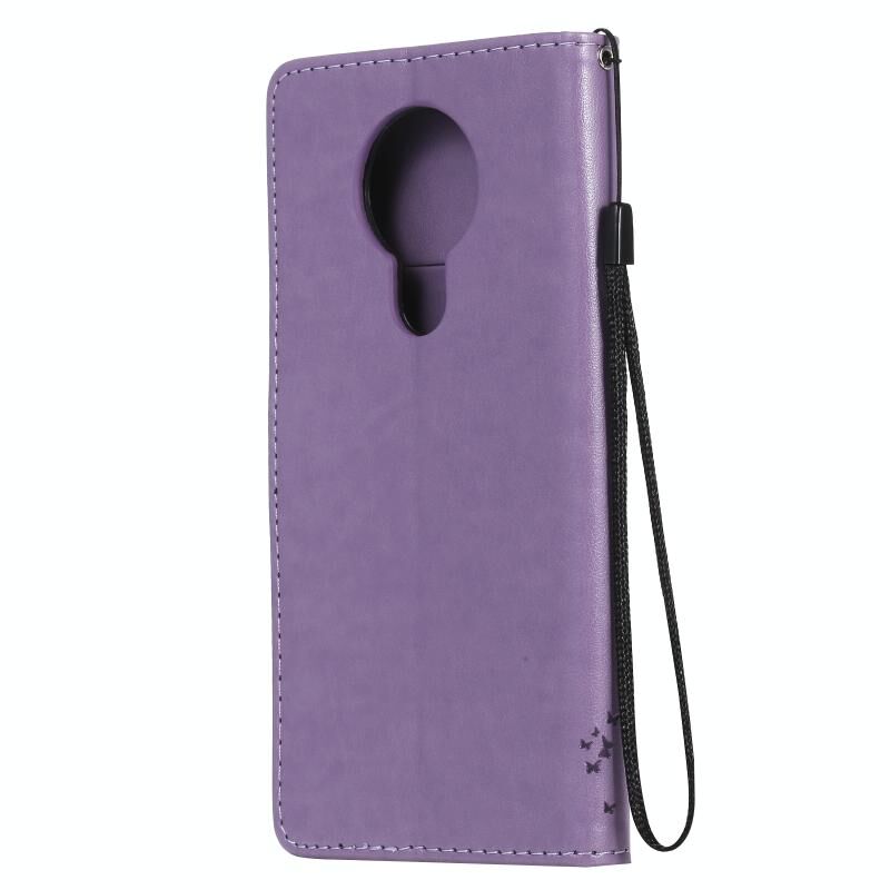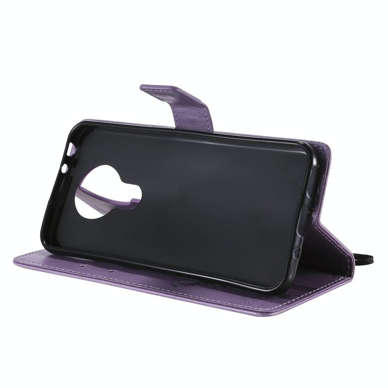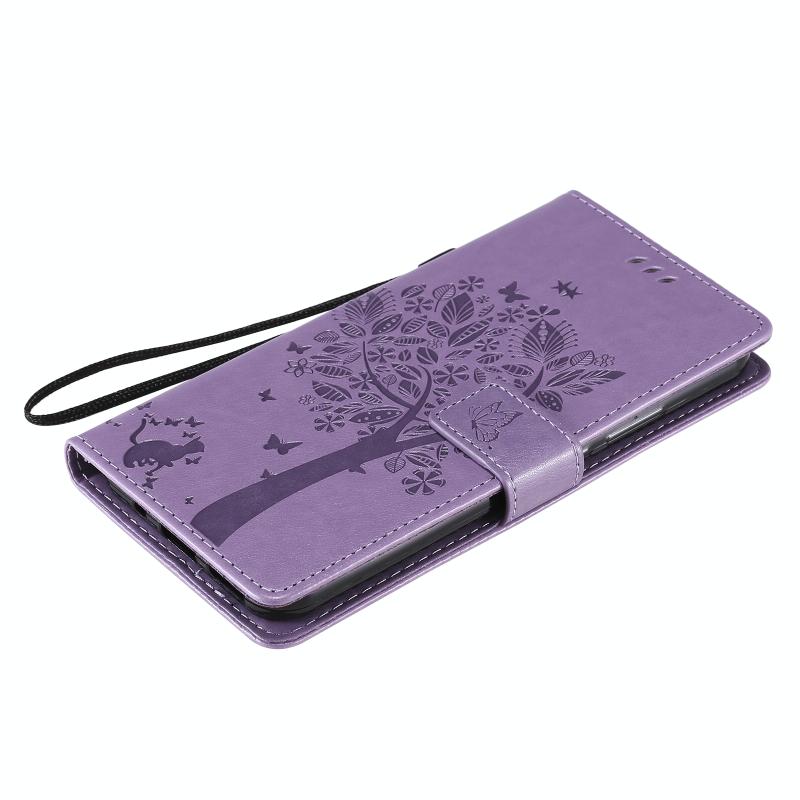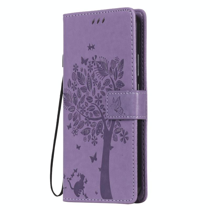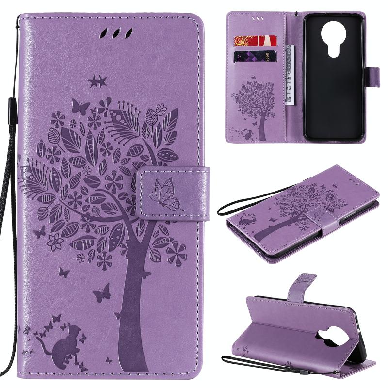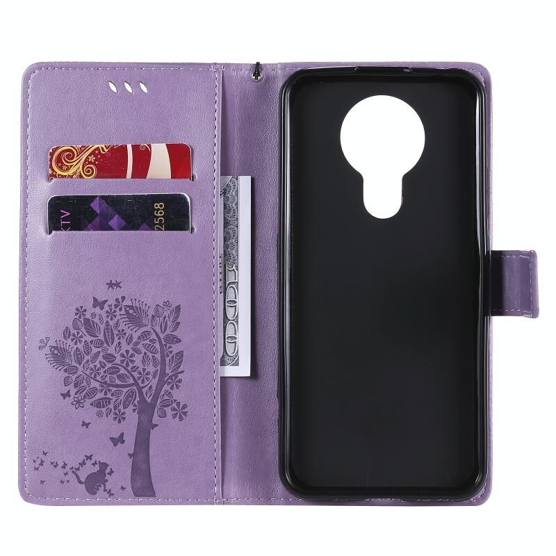 For Nokia 3.4 Tree & Cat Pattern Pressed Printing Horizontal Flip PU Leather Case with Holder & Card Slots & Wallet & Lanyard(Light Purple)
