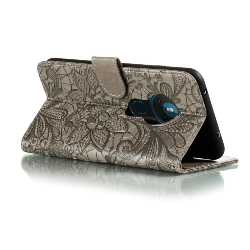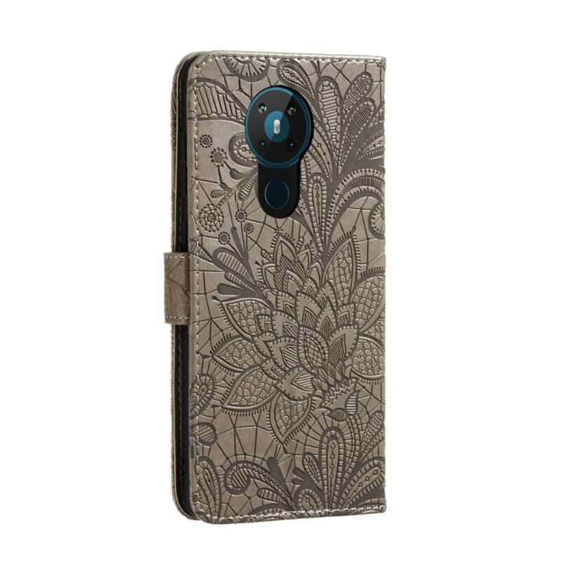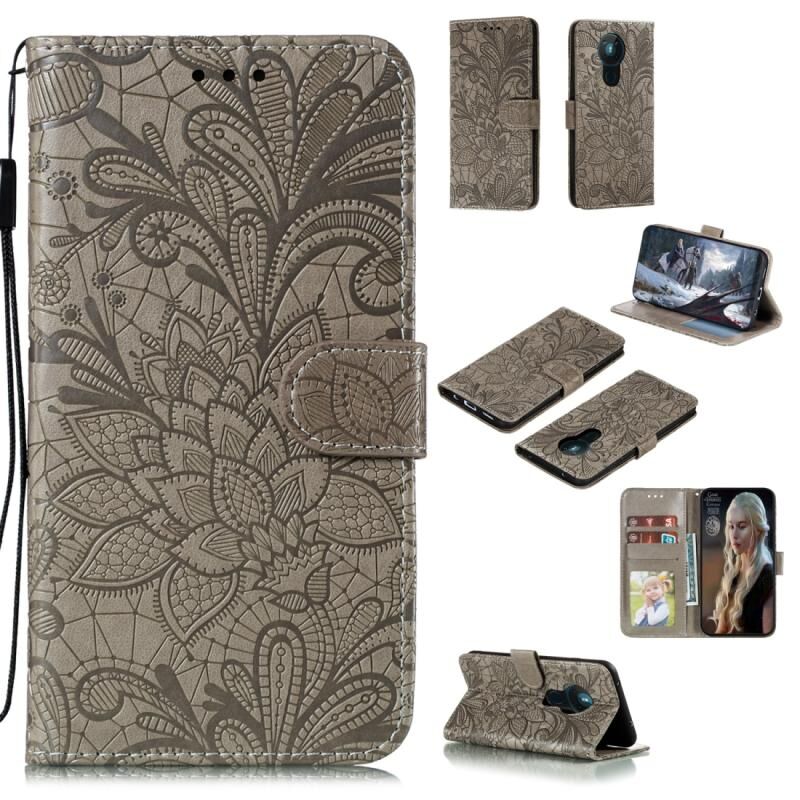 For Nokia 5.3 Lace Flower Embossing Pattern Horizontal Flip Leather Case , with Holder & Card Slots & Wallet & Photo Frame & Lanyard(Grey)