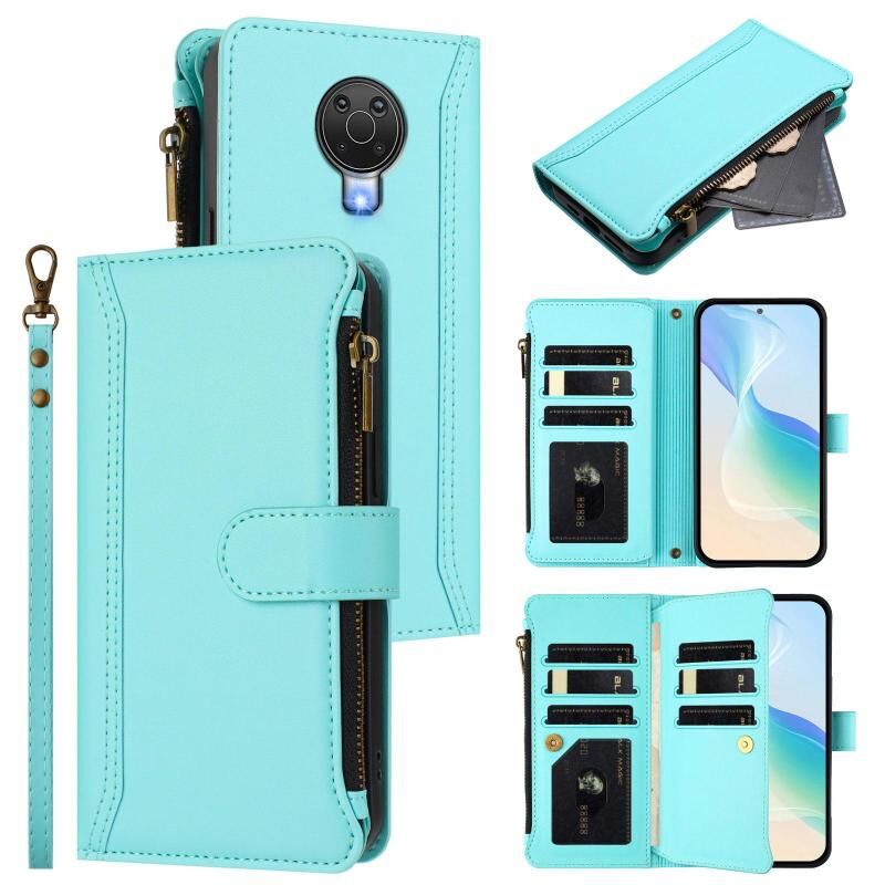 For Nokia 6.3 / G20 / G10 Magnetic Closure 9 Card Slots Zipper Leather Case with Hand Strap(Mint Green)