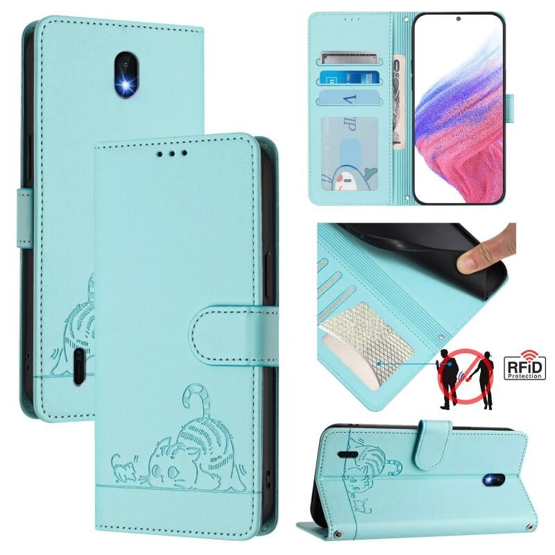 Θήκη τηλεφώνου από δέρμα με ανάγλυφο σχέδιο γάτας και καρδιάς για Nokia C01 Plus / C1 2ης Έκδοσης με λουρί (Μέντας Πράσινο)