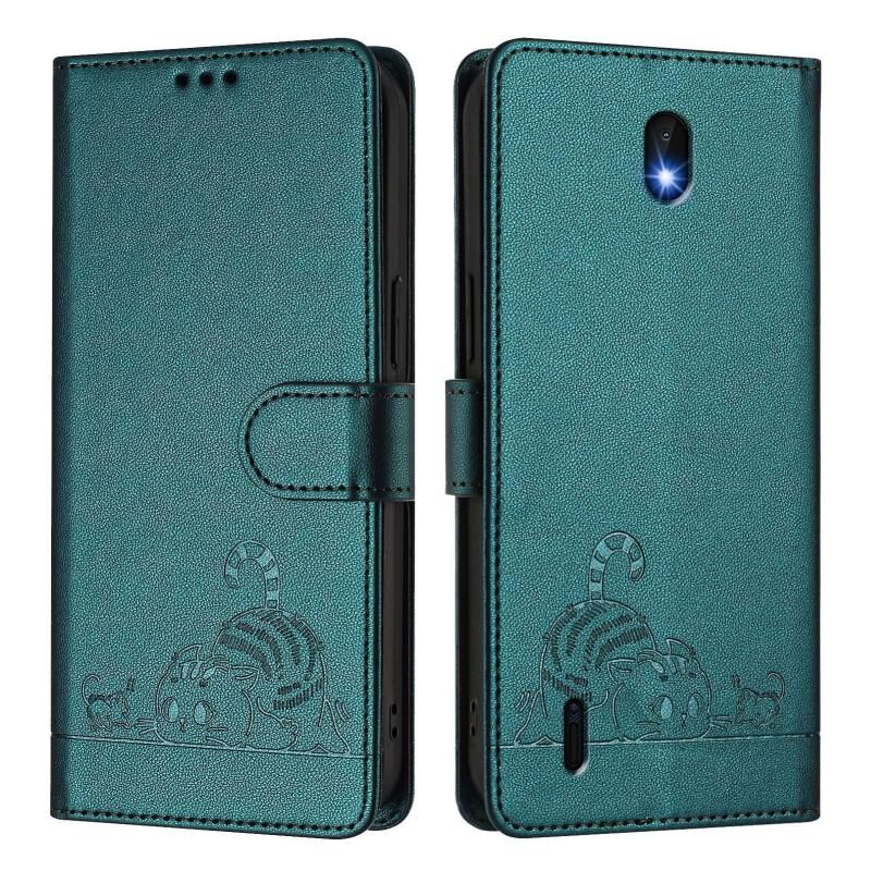Θήκη τηλεφώνου από δέρμα με ανάγλυφο σχέδιο γάτας και καρδιάς για Nokia C01 Plus / C1 2ης Έκδοσης με λουρί (Μέντας Πράσινο)