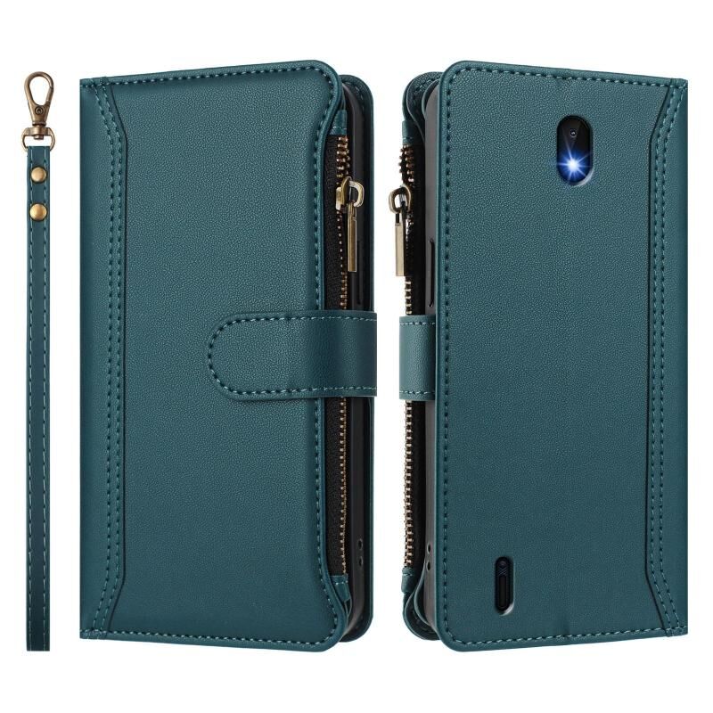 For Nokia C01 Plus / C1 2nd Edition Magnetic Closure 9 Card Slots Zipper Leather Case with Hand Strap(Dark Green)