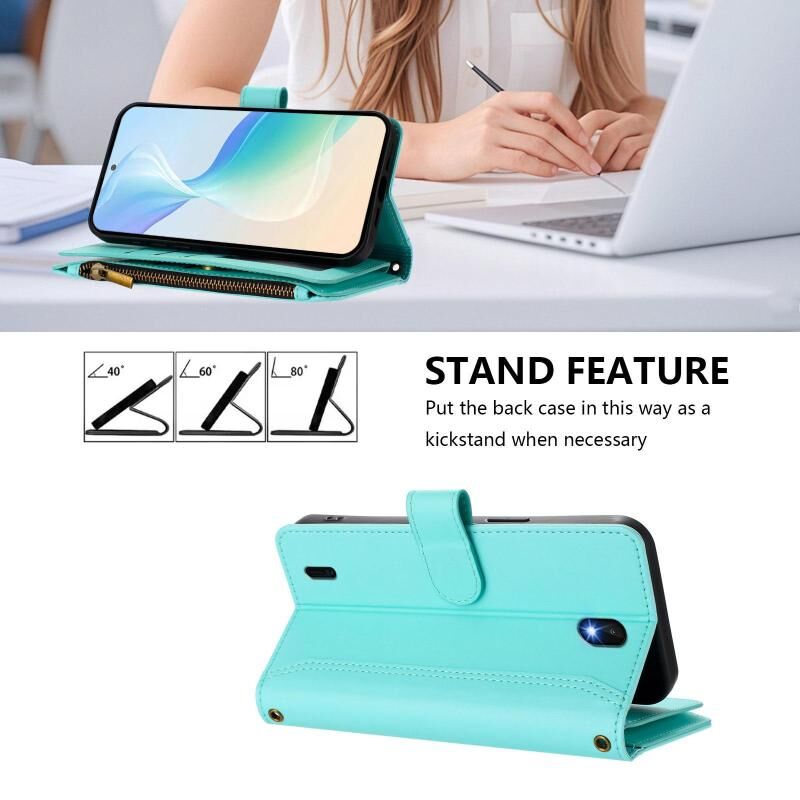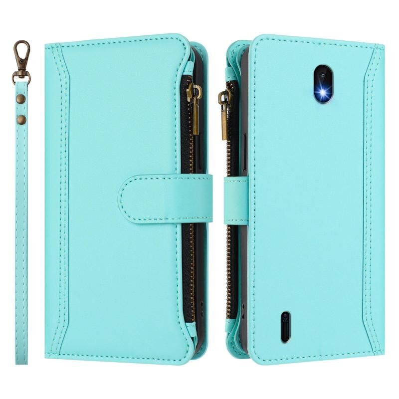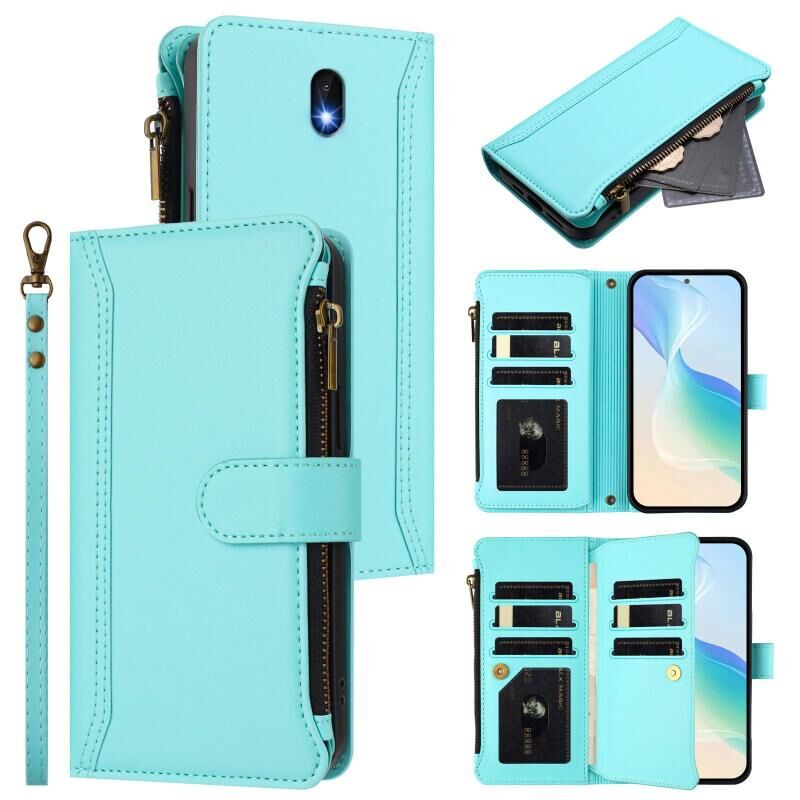 For Nokia C01 Plus / C1 2nd Edition Magnetic Closure 9 Card Slots Zipper Leather Case with Hand Strap(Mint Green)
