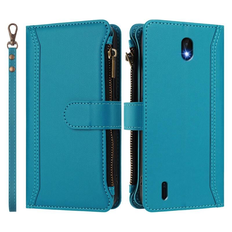 For Nokia C01 Plus / C1 2nd Edition Magnetic Closure 9 Card Slots Zipper Leather Case with Hand Strap(Turquoise)