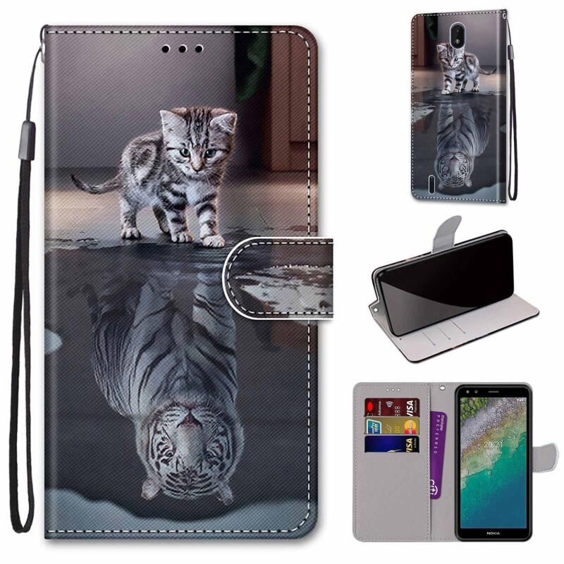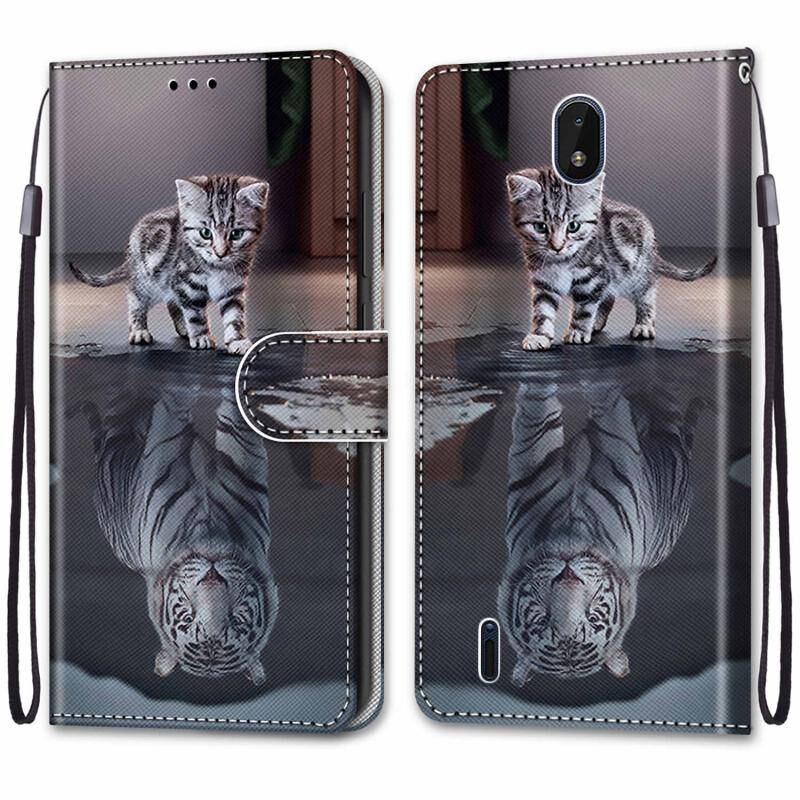 Θήκη τηλεφώνου δέρμα κατασκευής για Nokia C01 Plus με πολύχρωμο σχέδιο, υφή σταυρού, οριζόντιο άνοιγμα, βάση στήριξης, θήκες για κάρτες, πορτοφόλι και κορδόνι (Γάτα που μεταμορφώνεται σε τίγρη)