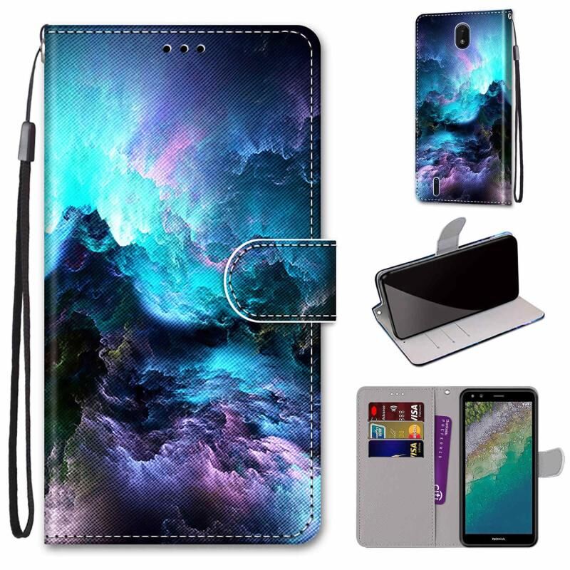 Θήκη τηλεφώνου δέρμα κατασκευής για Nokia C01 Plus με σχέδιο πολύχρωμης ζωγραφικής, υφή σταυρού, οριζόντιο άνοιγμα, με βάση στήριξης & θήκες καρτών & πορτοφόλι & κορδόνι (Πολύχρωμα Σύννεφα)