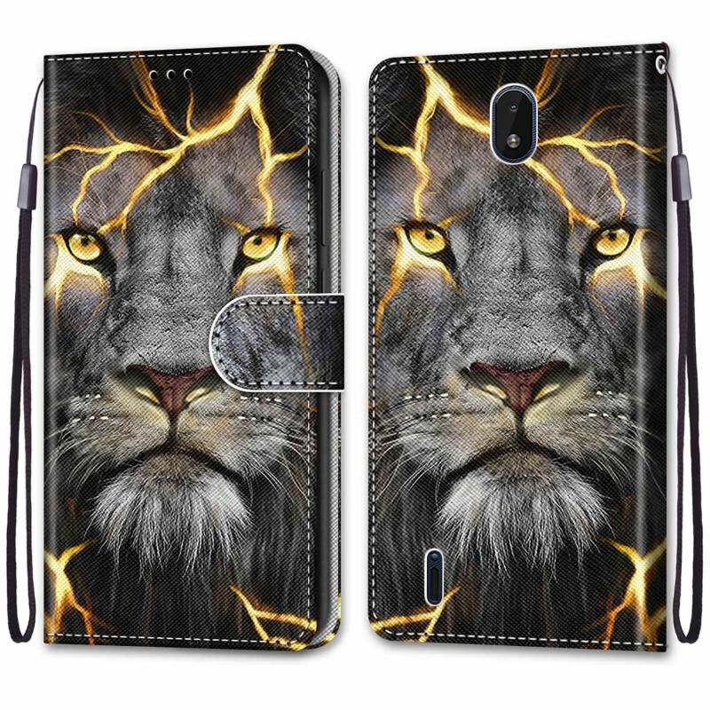 Θήκη τηλεφώνου δέρμα κατασκευής με οριζόντιο άνοιγμα για Nokia C01 Plus με πολύχρωμο σχέδιο, ανάγλυφη υφή, βάση στήριξης, θήκες για κάρτες, πορτοφόλι και κορδόνι (Fission Lion)