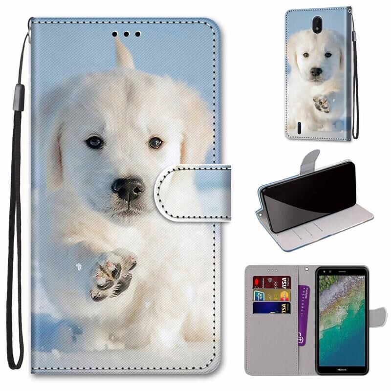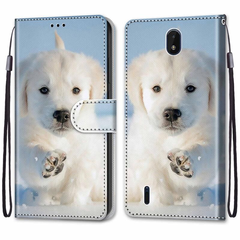 Θήκη τηλεφώνου δερμάτινη με σχέδιο, υφή σταυρού, οριζόντιο άνοιγμα, για Nokia C01 Plus, με βάση στήριξης, θήκες καρτών, πορτοφόλι & λουρί (Snow Puppy)