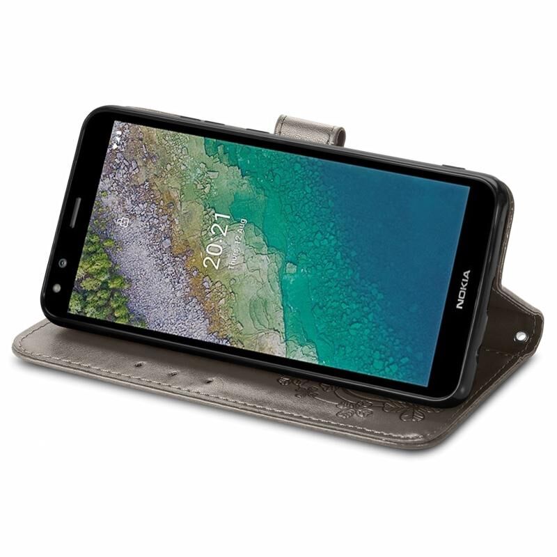 Για το Nokia C01 Plus Four-leaf Clasp ανάγλυφη αγκράφα Κινητό τηλέφωνο προστασία δερμάτινη θήκη με κορδόνι & υποδοχή για κάρτες & πορτοφόλι & βραχίονα λειτουργία (γκρι)