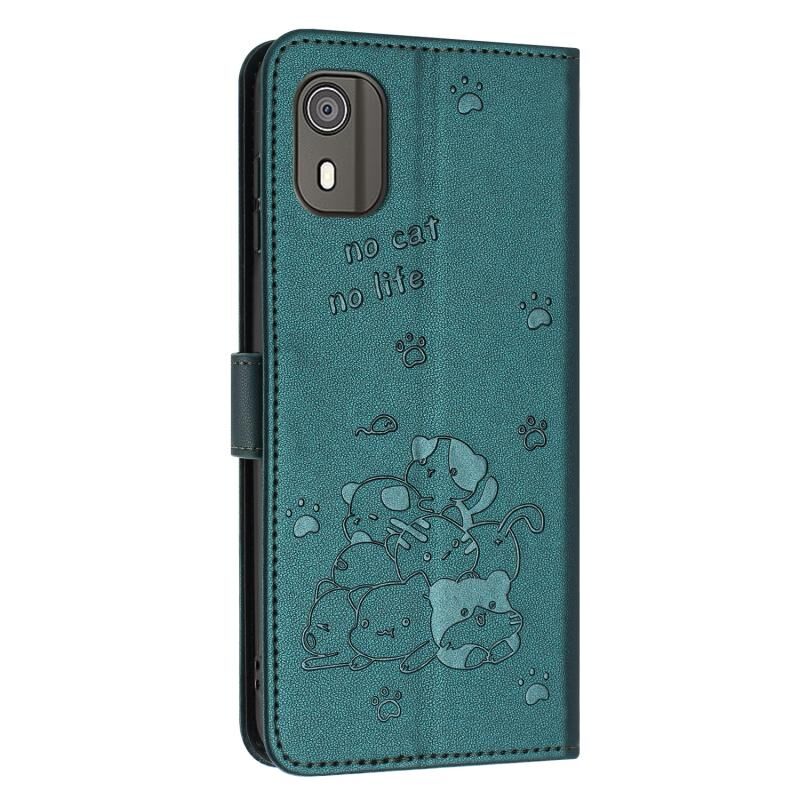 Θήκη δερμάτινη για Nokia C02 με ανάγλυφο γατάκι και κορδόνι (Μπλε)