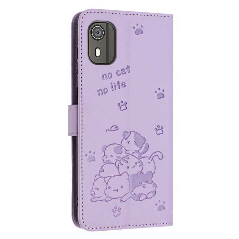 Θήκη δερμάτινη για Nokia C02 με ανάγλυφο γατάκι και κορδόνι (Μωβ)