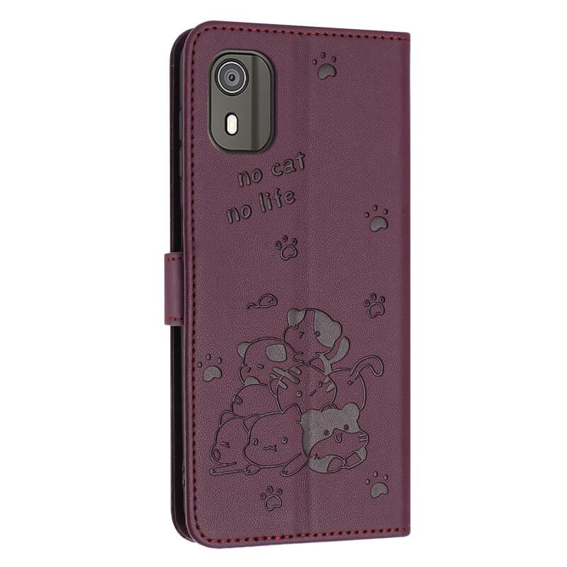 Θήκη δερμάτινη για Nokia C02 με ανάγλυφο γατάκι και κορδόνι (Μπλε)
