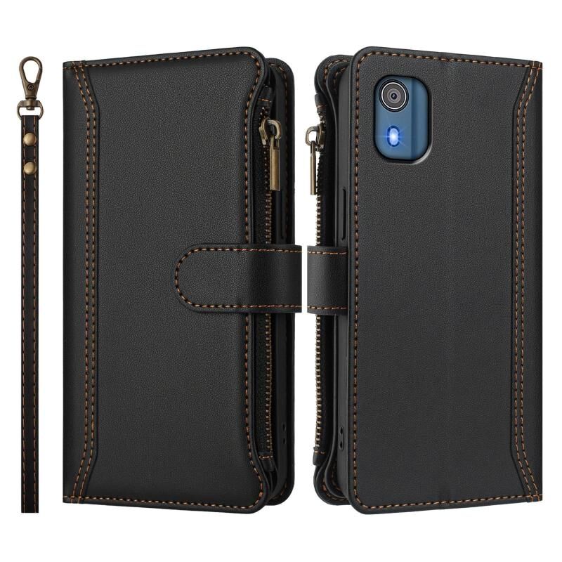 For Nokia C02 Magnetic Closure 9 Card Slots Zipper Leather Case with Hand Strap(Black)