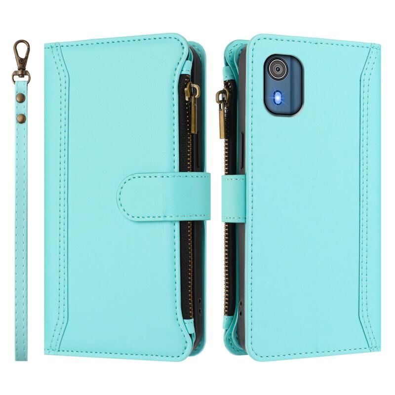 For Nokia C02 Magnetic Closure 9 Card Slots Zipper Leather Case with Hand Strap(Mint Green)