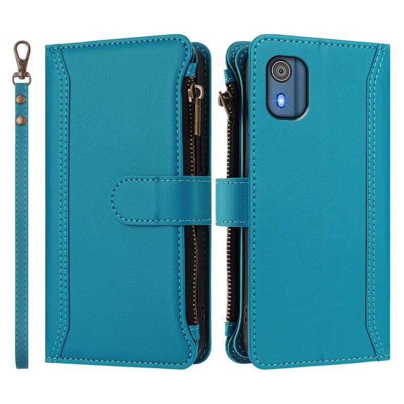 For Nokia C02 Magnetic Closure 9 Card Slots Zipper Leather Case with Hand Strap(Turquoise)