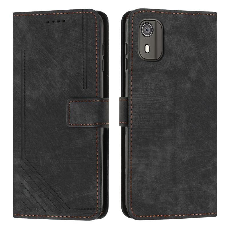 Για το Nokia C02 δέρμα αισθάνομαι λωρίδα μοτίβο δερμάτινη θήκη τηλεφώνου με κορδόνι (μαύρο)