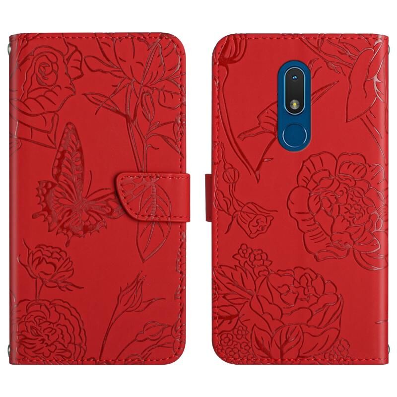 Θήκη τηλεφώνου από δέρμα με ανάγλυφο σχέδιο πεταλούδας και παιώνιας για Nokia C03 2020 (Κόκκινο)