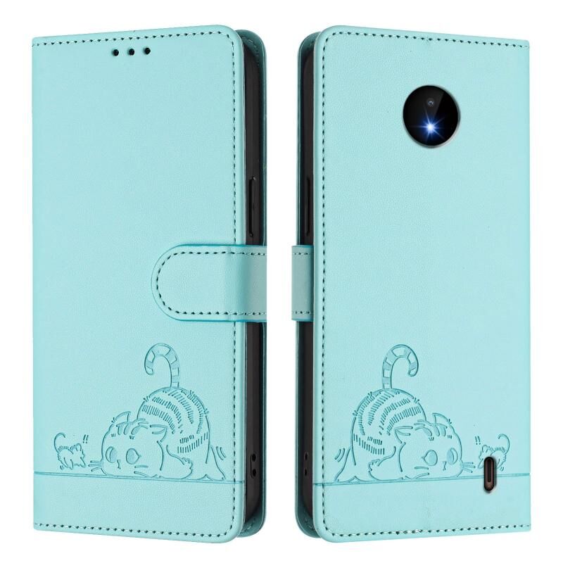 Θήκη τηλεφώνου από δέρμα με ανάγλυφο σχέδιο γάτας και ποντικού για Nokia C10 / C20 με κορδόνι (Μέντας Πράσινο)