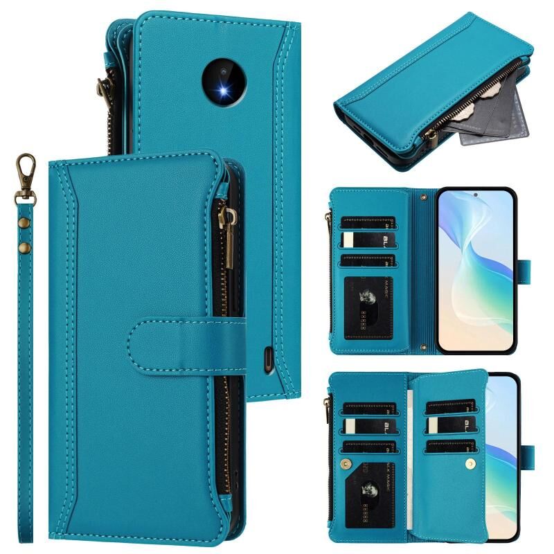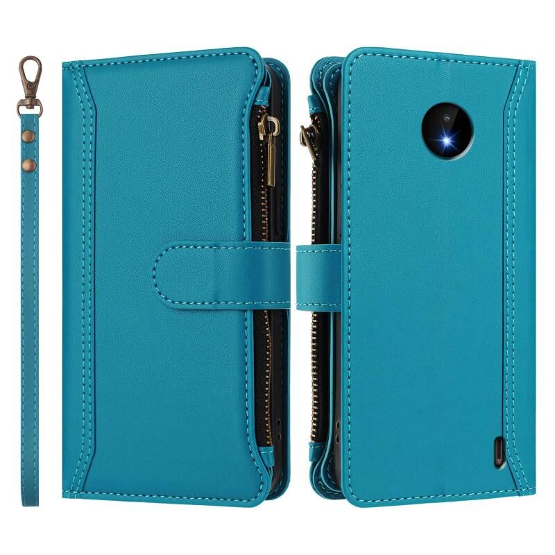 For Nokia C10 / C20 Magnetic Closure 9 Card Slots Zipper Leather Case with Hand Strap(Turquoise)
