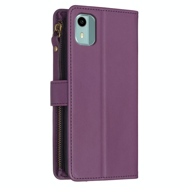 Θήκη τηλεφώνου τύπου flip από δέρμα με φερμουάρ και 9 θήκες καρτών για Nokia C12 (Ανοιχτό Μωβ)