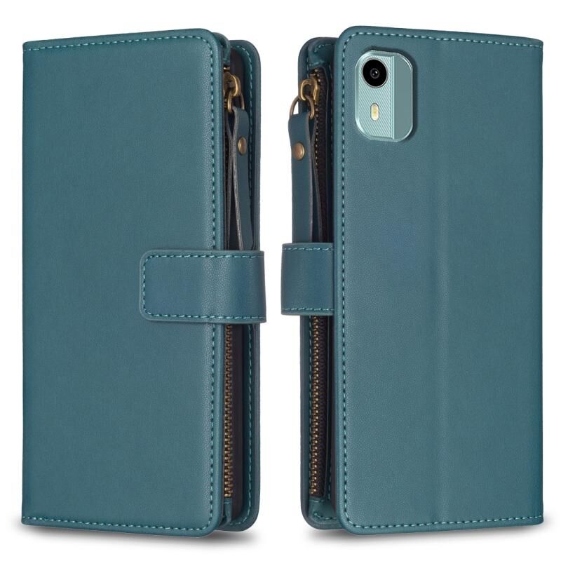 Θήκη τηλεφώνου τύπου flip από δέρμα με φερμουάρ και 9 θήκες καρτών για Nokia C12 (πράσινο)