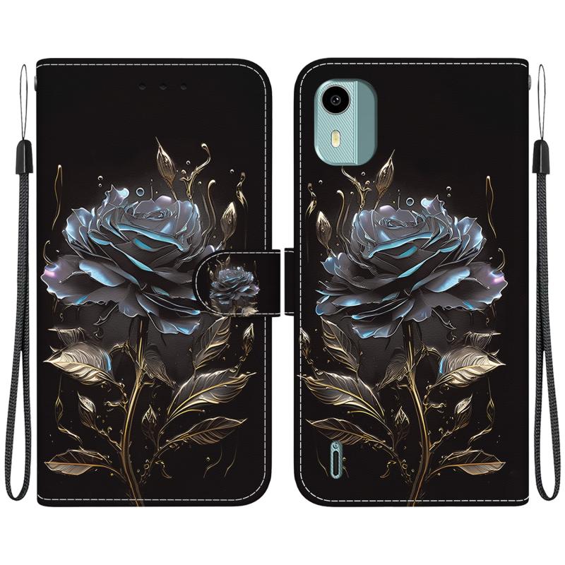 For Nokia C12 Crystal Texture Colored Drawing Leather Phone Case(Black Rose)