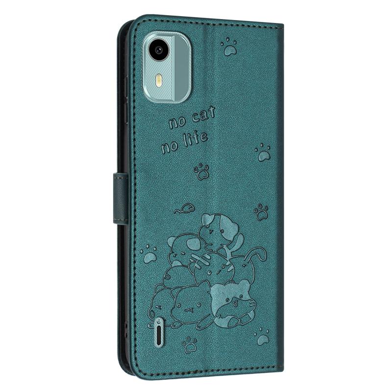 For Nokia C12 Embossed Kitten Phone Leather Case with Lanyard(Dark Green)