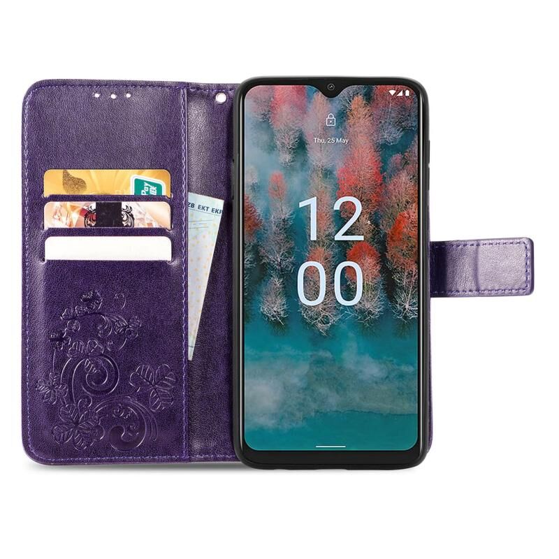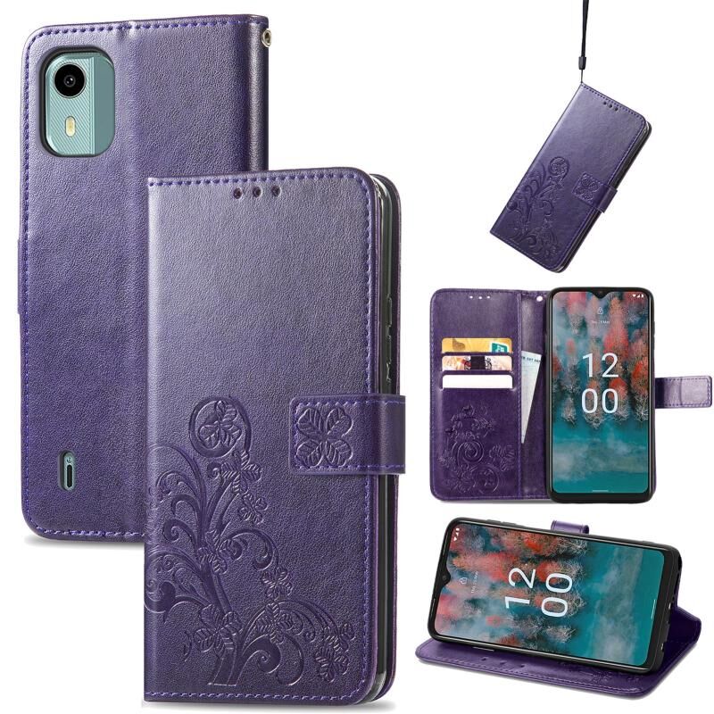 Για Nokia C12 τετράφυλλο κούμπωμα ανάγλυφο αγκράφα δερμάτινη θήκη τηλεφώνου (μωβ)