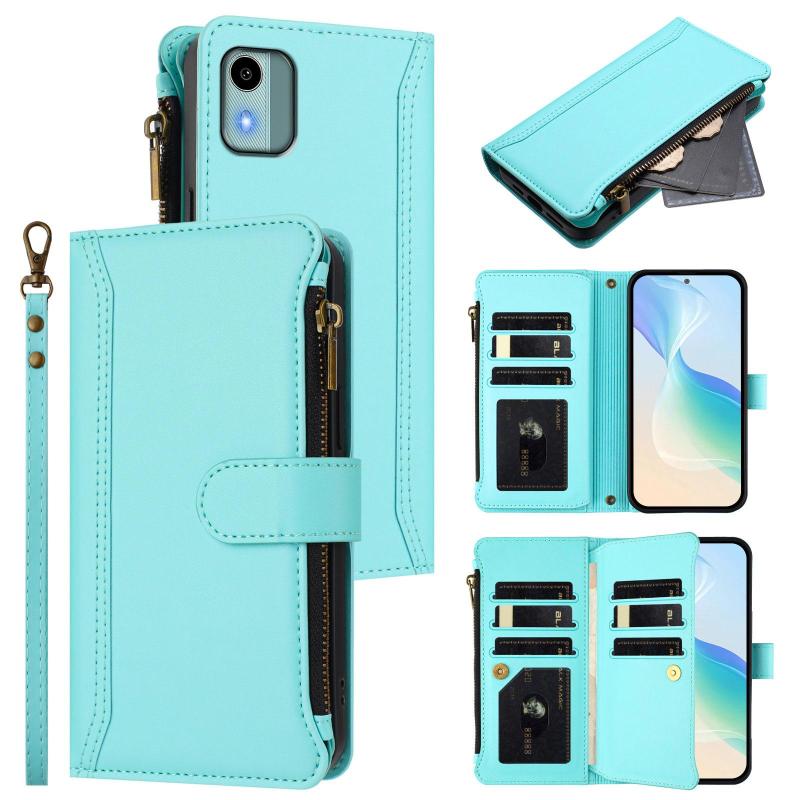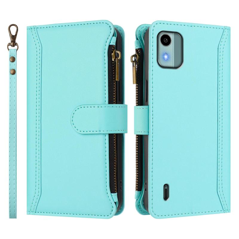 For Nokia C12 Magnetic Closure 9 Card Slots Zipper Leather Case with Hand Strap(Mint Green)