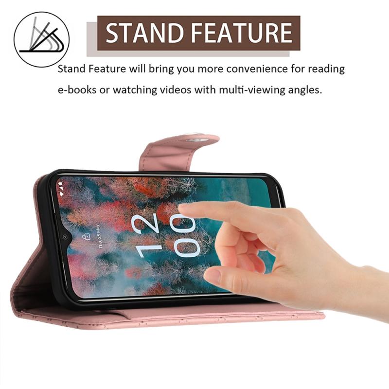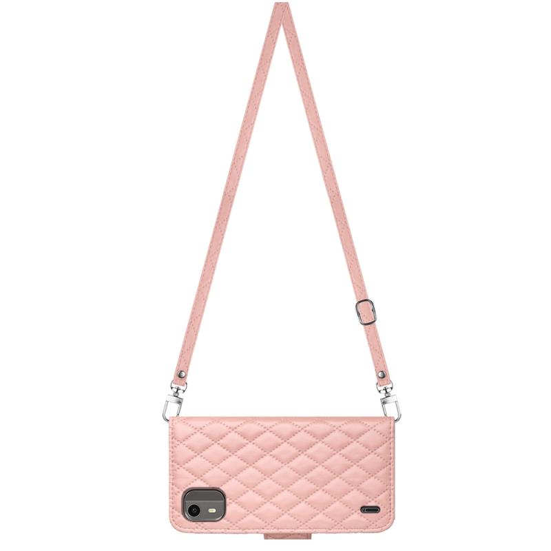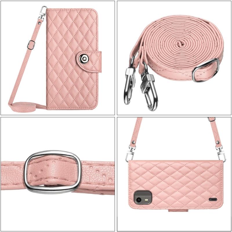 For Nokia C12 Rhombic Texture Flip Leather Phone Case with Long Lanyard(Coral Pink)