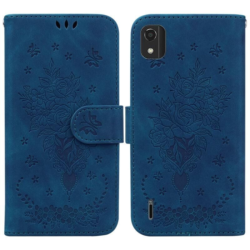 Θήκη τηλεφώνου από δέρμα με ανάγλυφο σχέδιο πεταλούδας τριαντάφυλλου για Nokia C2 2ης Έκδοσης (Κόκκινο)