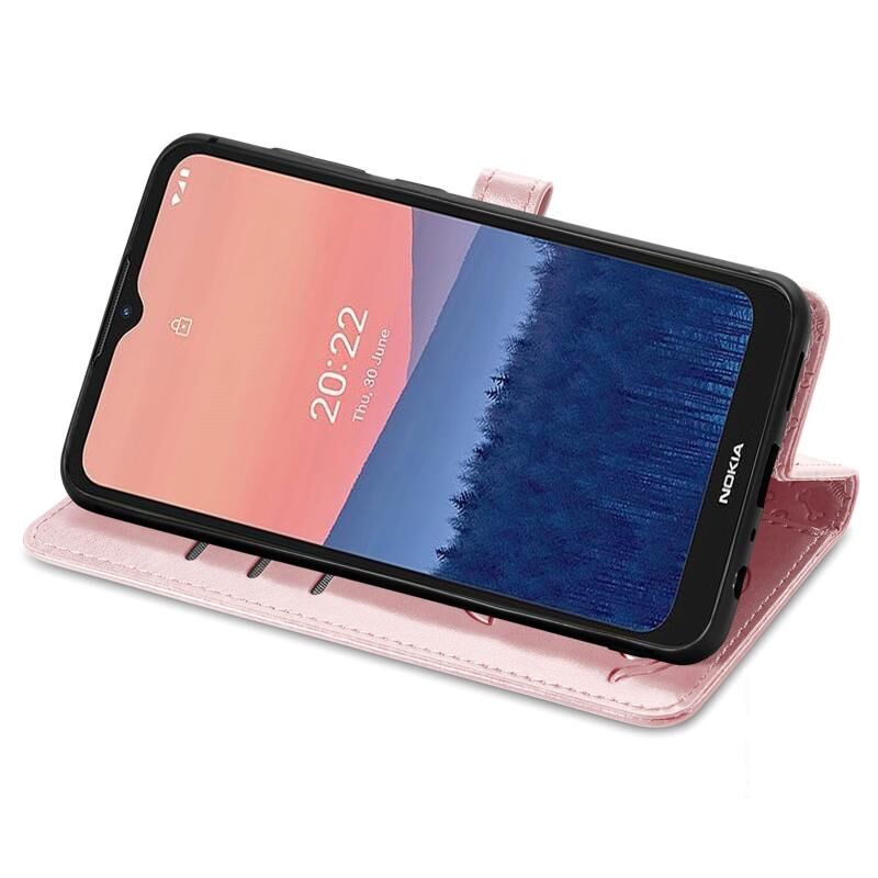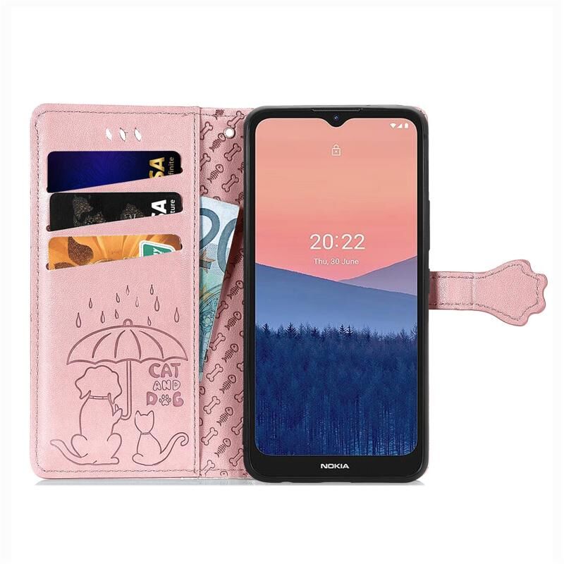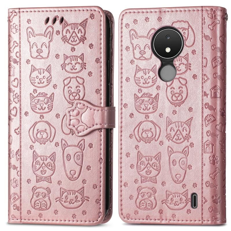 Θήκη τηλεφώνου από δέρμα με ανάγλυφα σχέδια χαριτωμένων γάτας και σκύλου για Nokia C21 (Μωβ)