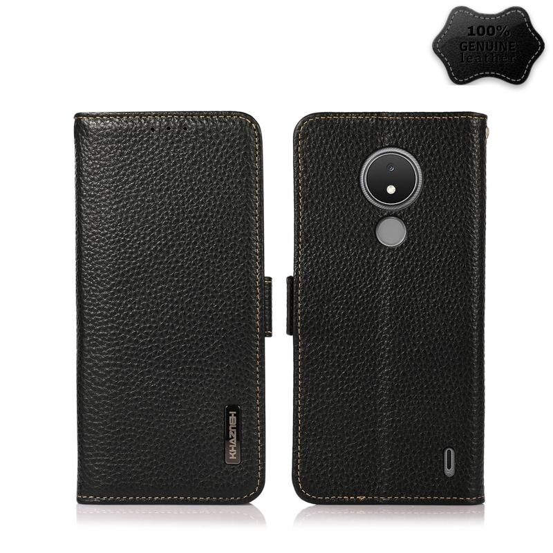 Θήκη τηλεφώνου Nokia C21 KHAZNEH με μαγνητικό κλείσιμο, γνήσιο δέρμα Litchi, RFID (Μαύρο)