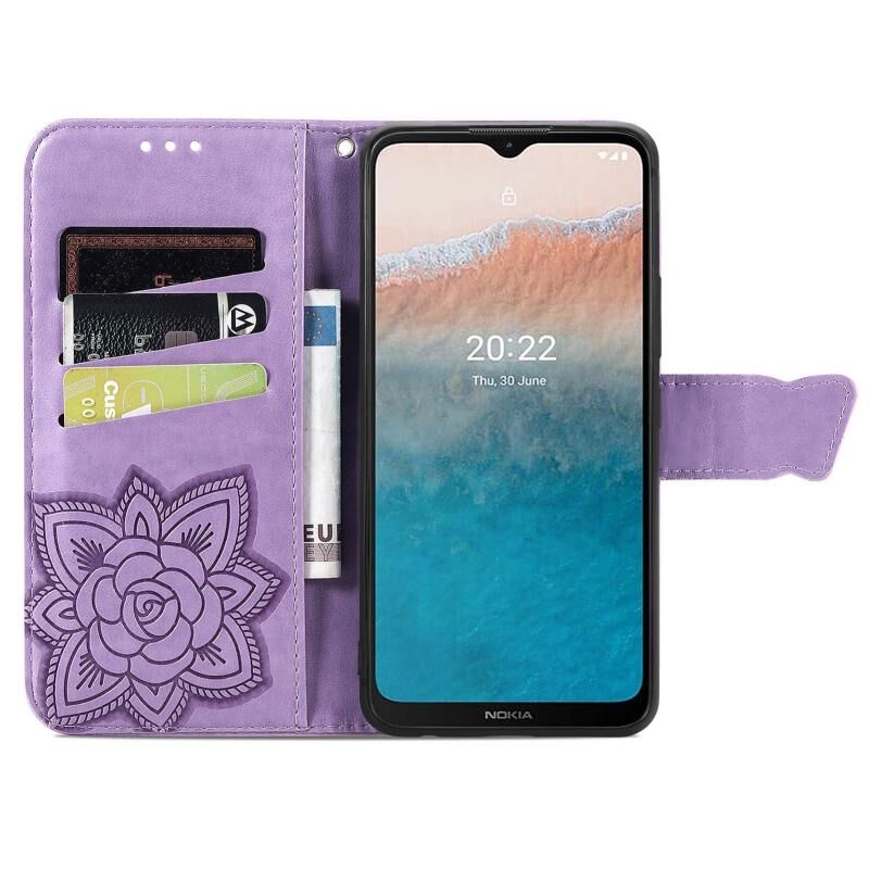 Θήκη τηλεφώνου από δέρμα με οριζόντιο άνοιγμα, ανάγλυφο με σχέδιο πεταλούδας και λουλουδιών, για Nokia C21 Plus (Μαύρο)