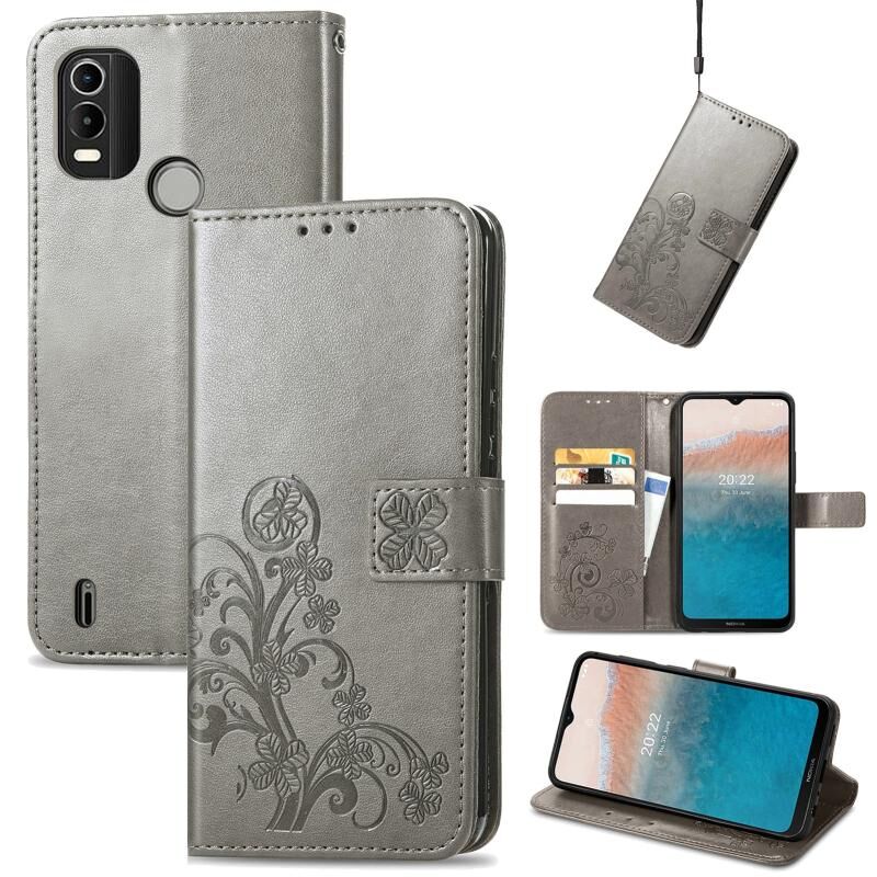 Για το Nokia C21 Plus τετράφυλλο κούμπωμα ανάγλυφη αγκράφα δερμάτινη θήκη τηλεφώνου (γκρι)